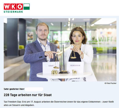 Solche Aussendungen verschickt die WKO Steiermark an ihre Mitglieder. Ist Steuern zahlen eine Zumutung?